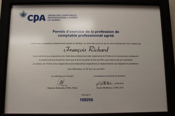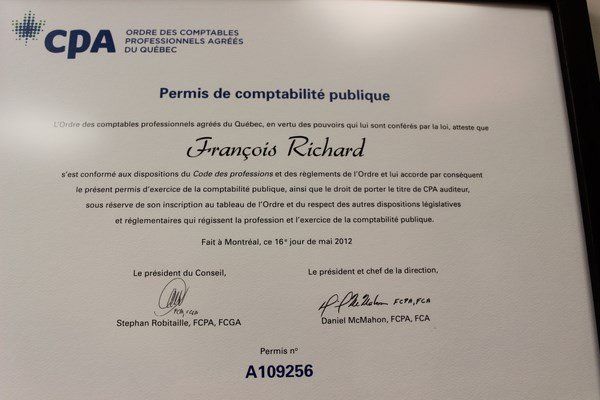 Membre de l'Ordre des comptables agréés du Québec depuis mars 1986